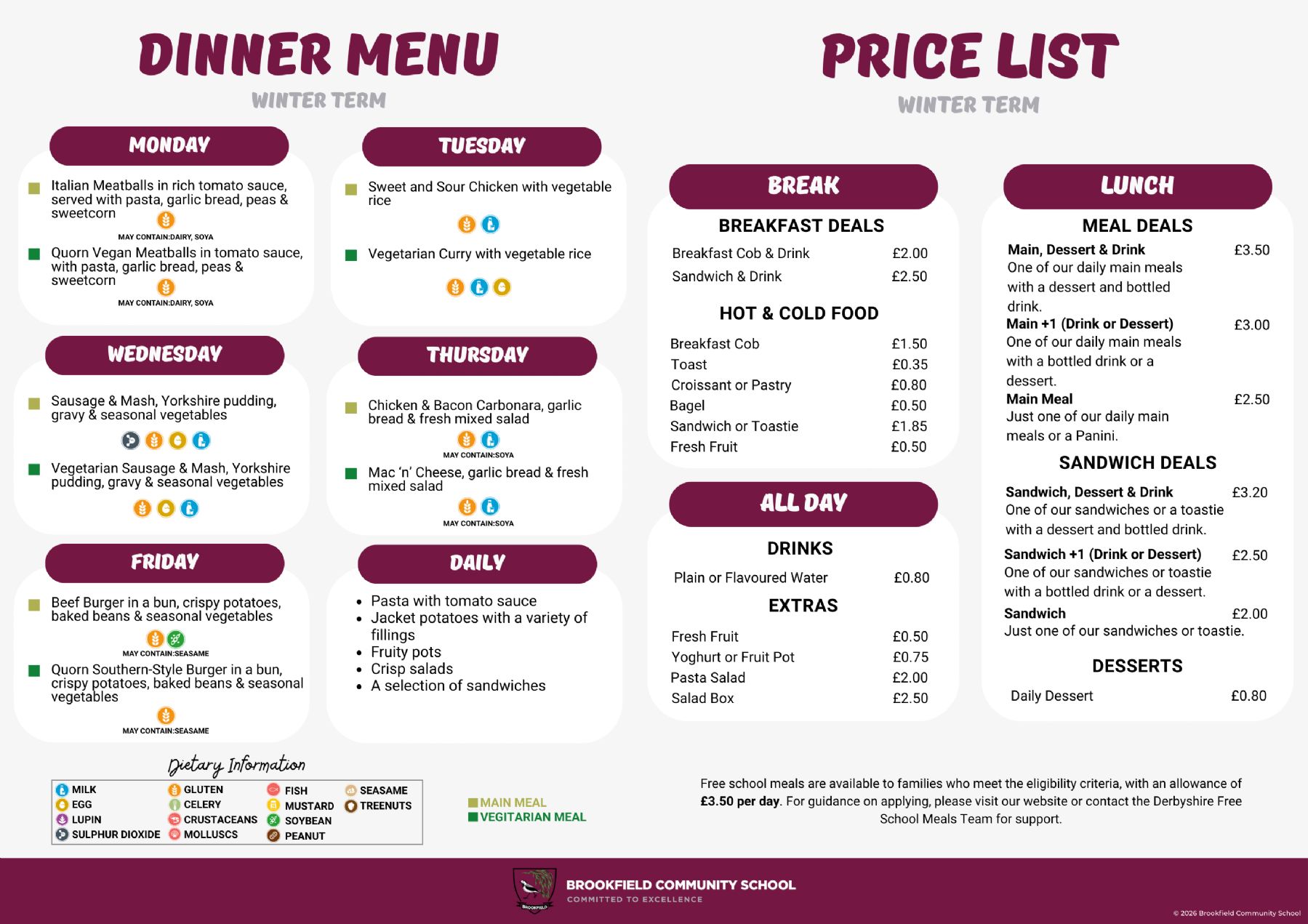 At Brookfield Community School, we offer a wide range of healthy eating options that are as full of flavour and nutritious. Every week, a different menu is on offer to students as shown below.
